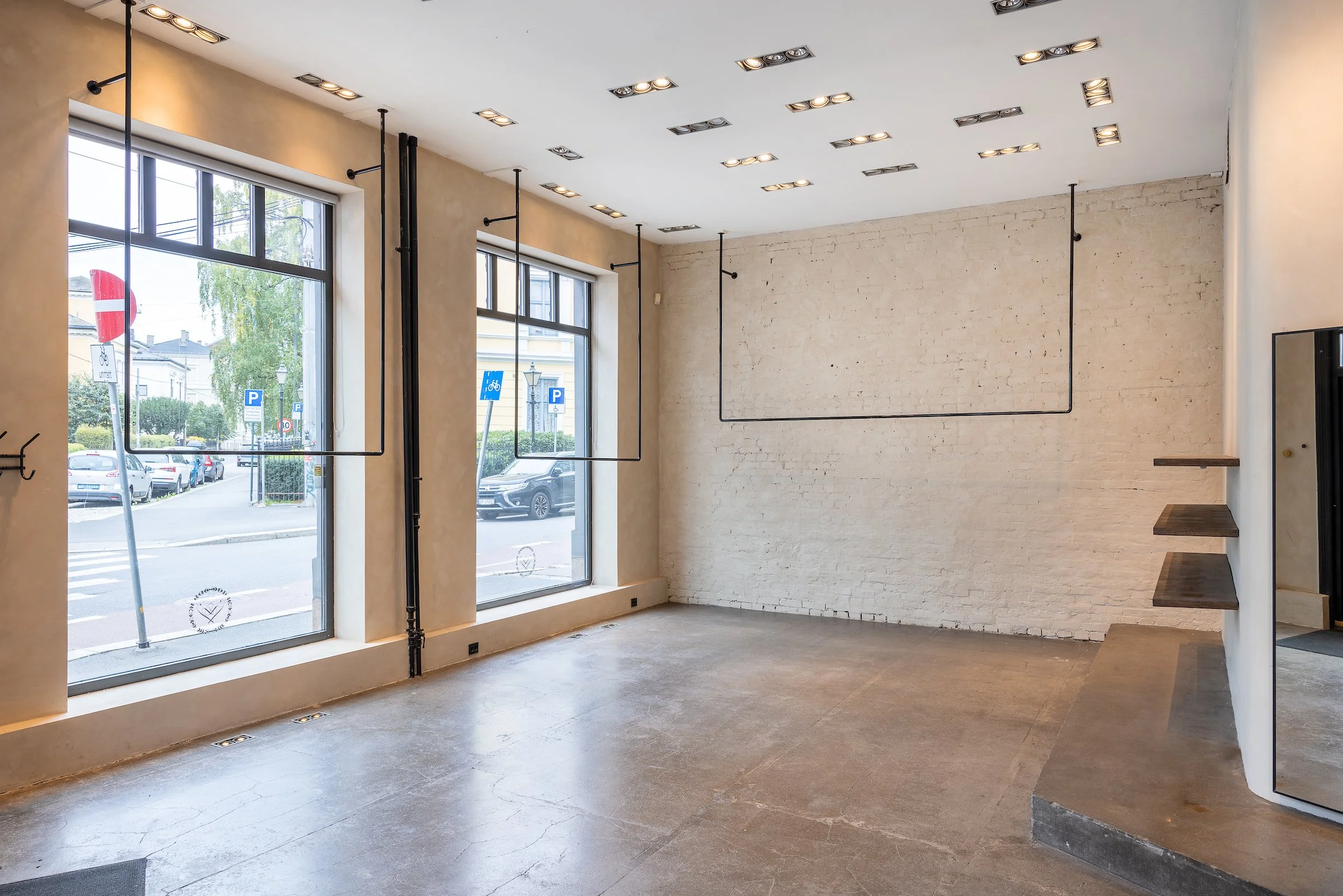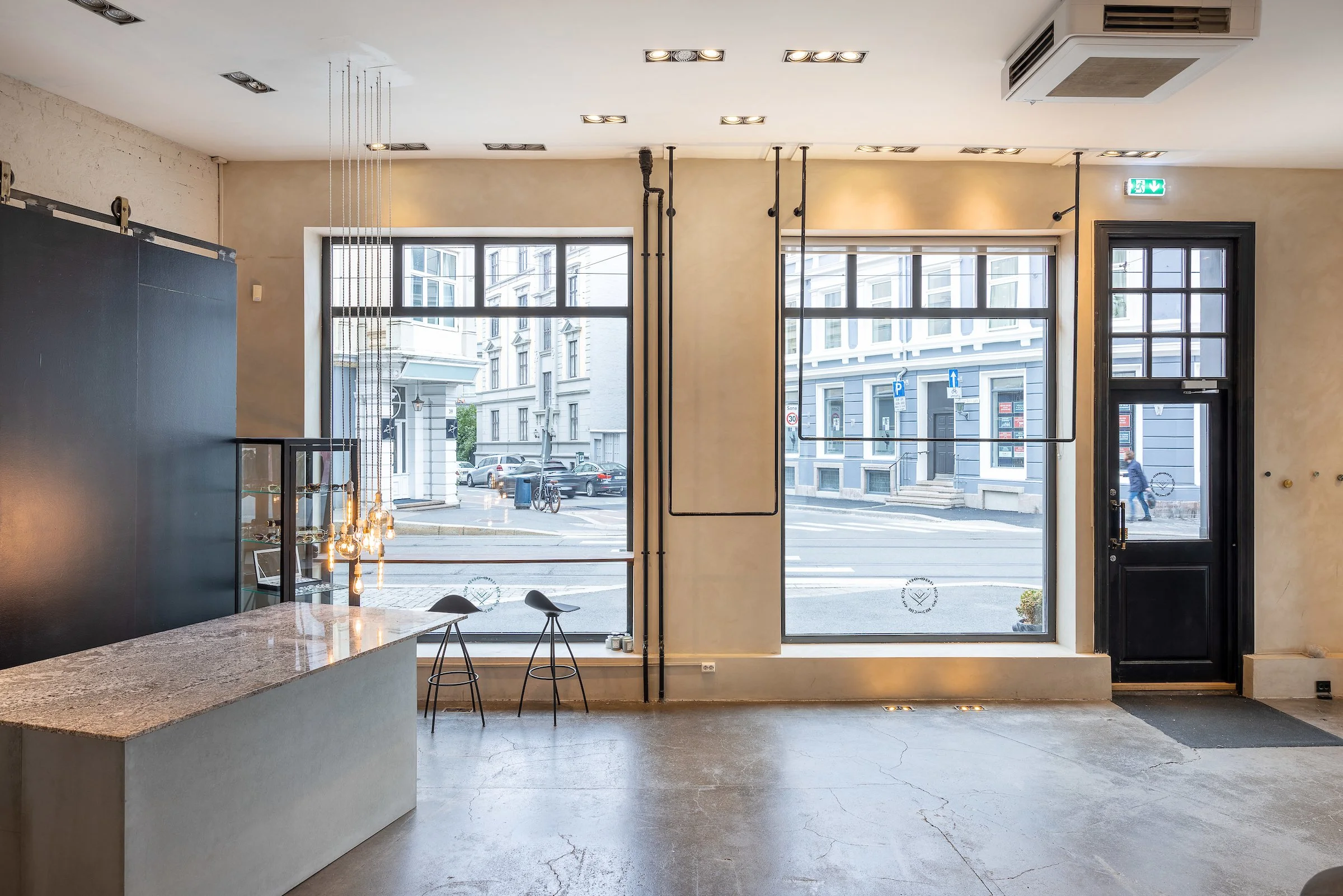 Lokalet ligger på hjørnet i en flott eiendom, godt med utstillingsvinduer.